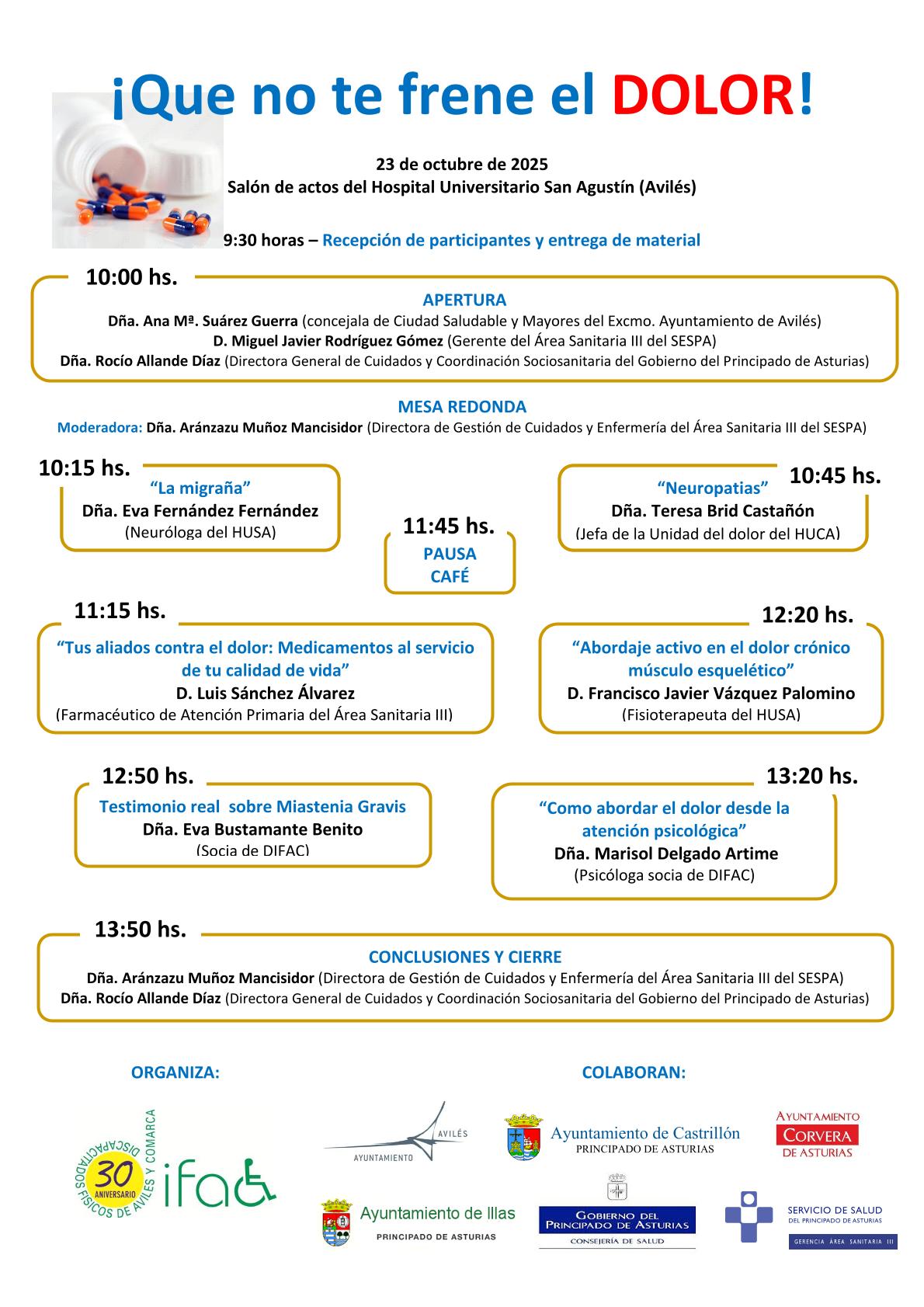 Os informamos Jornada de Salud “Que no te frene el dolor” que tendrá lugar el día 23 de octubre en el salón de actos del Hospital Universitario San Agustín (Avilés), a partir de las 10:00 horas.